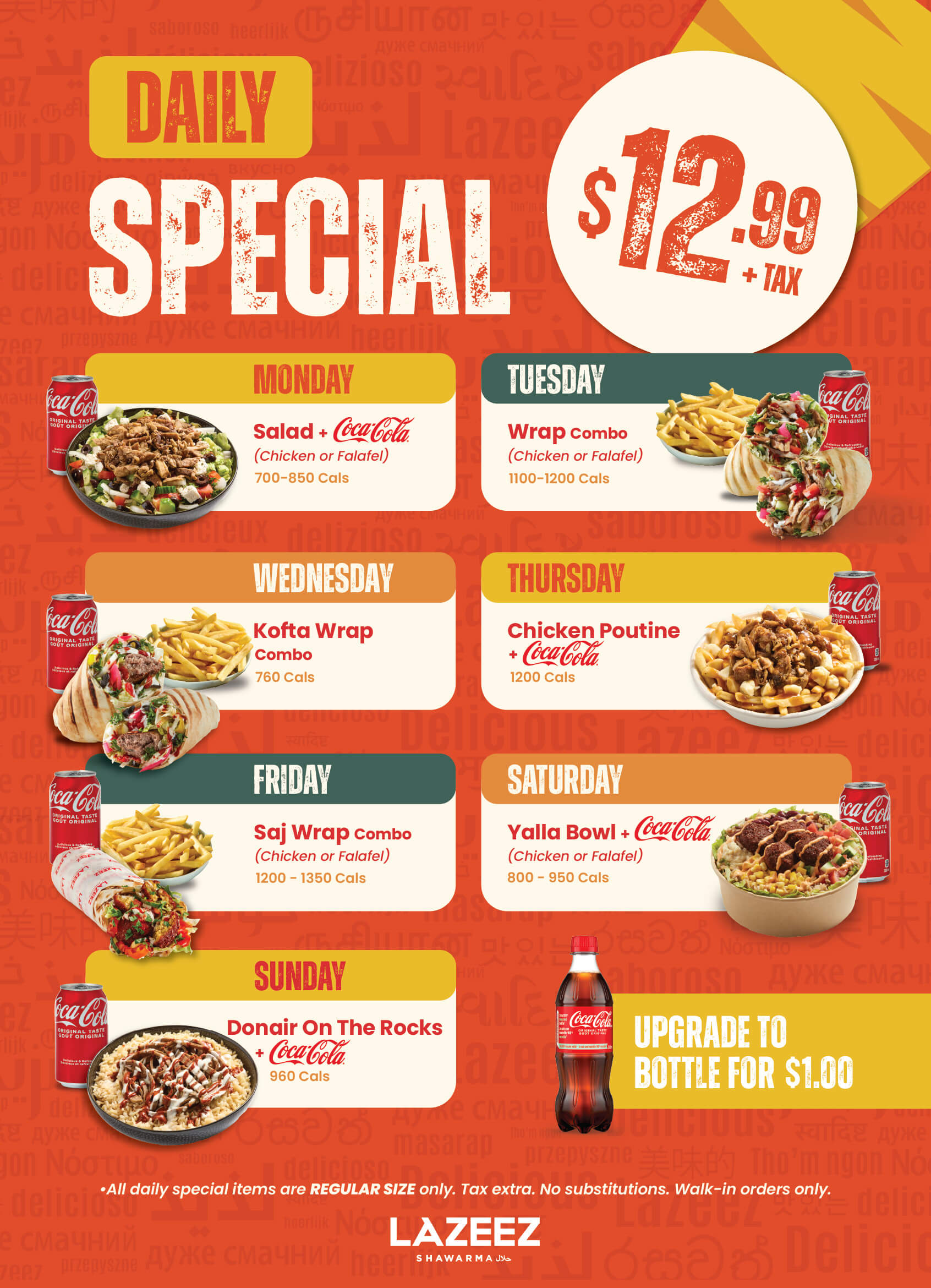 Topped with our famous mouth watering garlic sauce, tahini, and your choice of spice level, Lazeez platters are served with your choice of plain or lentil rice, any salad (60-405 cals), & choice of Fries (295 cals) or Potatoes (265 cals).